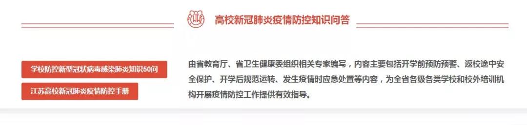 高校新冠肺炎疫情防控知識問答:提供疫情防控相關材料在線或下載學習,為高校開展疫情防控和師生實施個人防護提供有效指導。其中《學校防控新型冠狀病毒感染肺炎知識50問》由南京醫科大學編寫,主要内容包括新冠肺炎相關知識,防護要求和返校注意事項等;《江蘇高校新冠肺炎疫情防控手冊》由省教育廳、省衛生健康委組織相關專家編寫,主要内容包括開學前預防預警、返校途中安全保護、開學後規範運轉、發生疫情時應急處置等。
