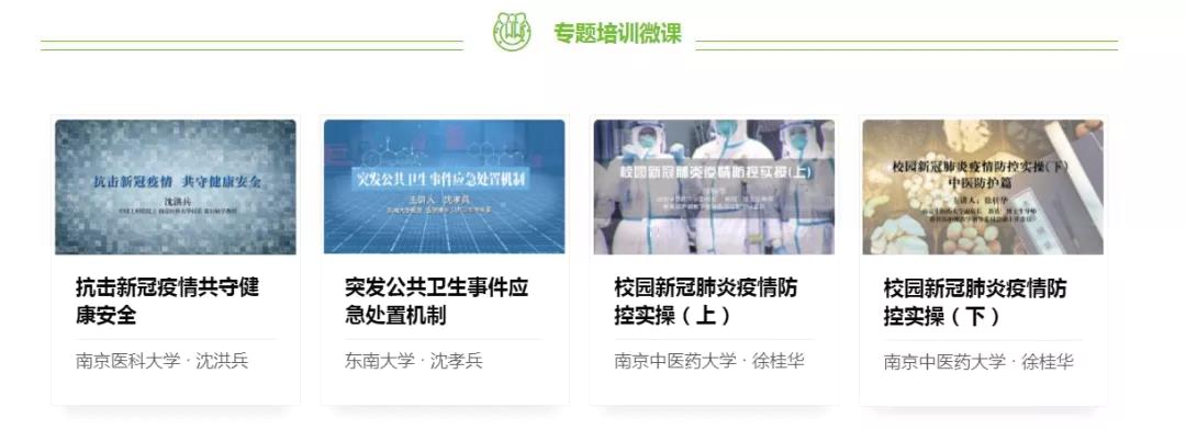 專題培訓微課:由省教育廳聘請流行病學、公共衛生學和護 理學等方面的醫學專家,專門就疫情防控拍攝《抗擊新冠疫情共守健康安全》《突發公共衛生事件應急處置機制》《校園新冠肺炎疫情防控實操(上、下)》,各專題具有較強的針對性、實用性和可操作性。