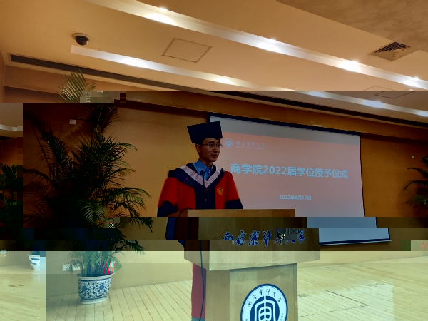 優秀研究生代表、考取南京大學博士研究生的潘天行同學,優秀本科生代表、考取中央财經大學碩士研究生的周倞伊同學先後發言。兩位同學首先代表伟德首页官网2022屆全體畢業生向培養我們的母校、向教導我們的師長,表達了最真摯的感謝。桃花潭水深千尺,不及南審同窗情;東西南北風常在,唯有師恩留心間。在發言中,他們回顧了在校3年、4年間學校和伟德首页官网的發展變化,見證了伟德首页官网工商管理與物流管理兩個專業成為國家級一流本科專業建設點的輝煌。最後莊嚴表示,将不忘最初的信仰,争做立大志、明大德、成大才、擔大任的時代新人。