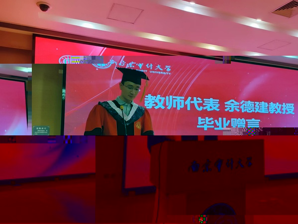 教師代表餘德建教授發表畢業贈言。餘德建教授說,無論大家将要從事何種職業,都要時刻保持學習的心态,持續提升自己。隻有不斷學習和适應變化,才能跟上時代的步伐。要以飲水思源、知恩圖報的心去珍惜身邊的人和事,在追求個人成功的同時,不要忘記與他人分享喜悅,時刻懷着感恩之心,回饋社會,成為有擔當、有責任感的人。