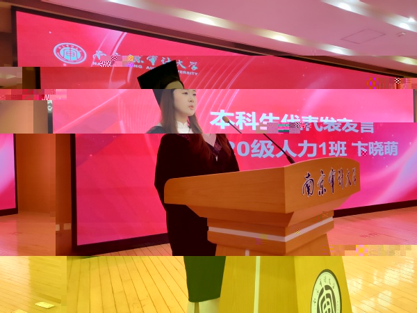 考取複旦大學研究生的2020級人力1班卞曉萌代表本科畢業生發言。卞曉萌首先向一路陪伴的母校、老師、親友表達最真摯的感謝。多謝愛意千千萬萬,多謝來自異鄉的溫暖,多謝包容與接納、肯定與鼓勵,多謝這倏忽四年中的每一個引路人。卞曉萌說,在這裡,我們有幸汲取老師博采衆長的理論,有幸沐浴忠誠擔當的政治品格,有幸與志同道合的朋友一同享受青春。是南審給予我們一個又一個登高望遠的階梯,讓我們有能力有底氣站在更高的舞台上不斷成長。畢業生代表一緻表示,2024屆畢業生将牢記母校校訓和學院院訓,努力用實際行動為母校争光添彩。